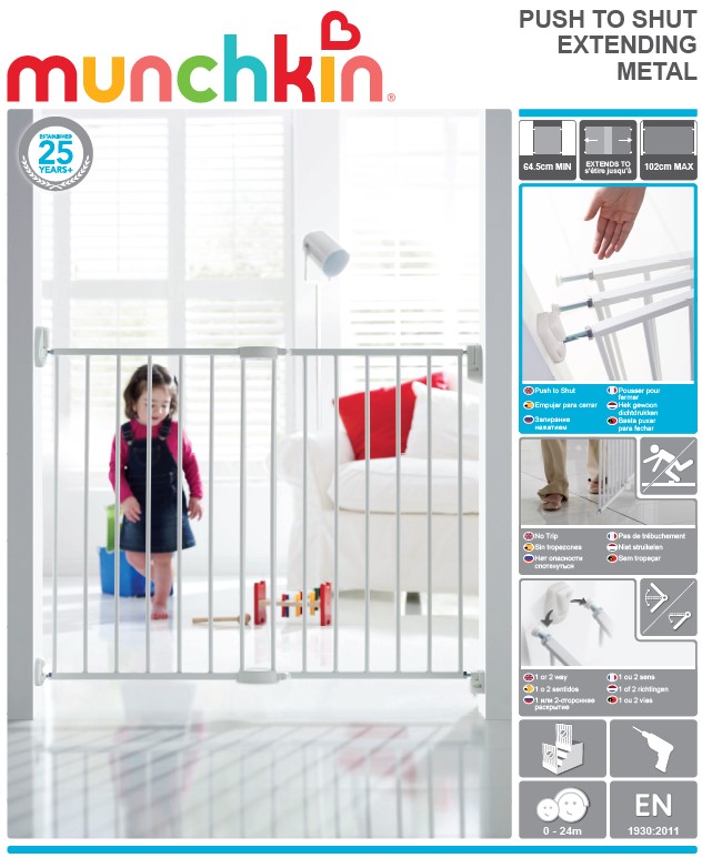 A Munchkin Easy Close kihúzható fém, gyerekvédő biztonsági rács a lépcső tetején vagy alján, illetve ajtónyílásoknál történő használatra készült. Erős acélból készült, közvetlenül a falra rögzíthető. Az extra széles bébikapu nyomásra nyíló és záródó rendszerrel rendelkezik, és nincs átlépő rúdja. Kihúzás nélkül a keskeny, szokatlan méretű nyílásokhoz is illeszkedik.