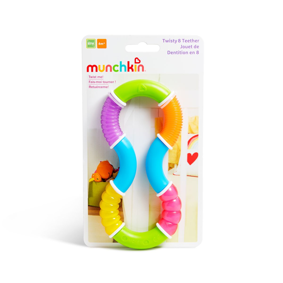 A fogzás igazi kínszenvedés lehet a babának és szüleinek is, de a díjnyertes Munchkin Twisty 8 rágóka segít enyhíteni a kellemetlenségek egy részét. 5 gyengéd és stimuláló textúrával rendelkezik, amelyek rágásra ösztönzik és enyhítik a baba fájós ínyét. A kis szájakhoz és kezekhez tökéletesen illeszkedik, csavarható, élénk színű, és csörgő hangokat ad ki, így kiváló fejlesztő játék is.